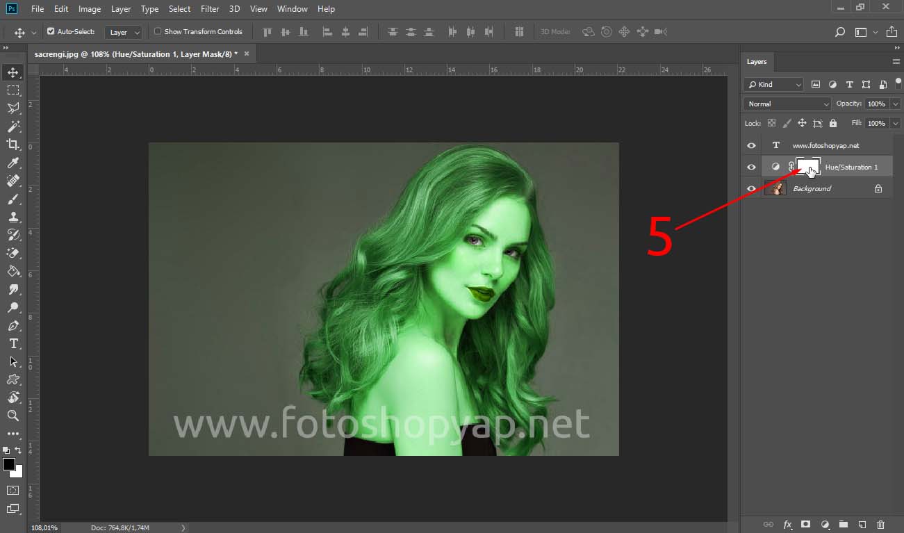 5- Bu kısımda tüm resmin seçtiğimiz renk ile değiştğini göreceğiz. Ok ile gösterilen Mask kısmına bir kere tıklıyoruz.